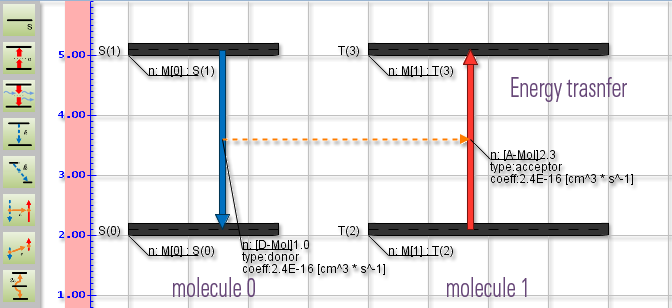 Energy transfer can occur between molecules or ions of different types. For example, energy transfer between a first ion and second ion occurs with the de-excitation of first ion from an excited state to the ground state and the simultaneous excitation of second ion from the ground state to an excited state. Note that for energy transfer, the ground states of both ions are involved.