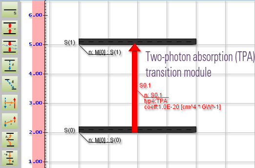 For simplicity, we left many other important terms out of this example equation – which may include single-photon, three-photon, or, generally speaking, multi-photon absorption, linear absorption, stimulated emission etc. Each multi-photon absorption term will have a factor of population density of the energy state from which the absorption occurs.The function of concentration N0(z,t) follows the following corresponding rate equation: