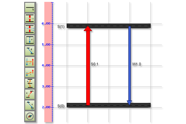 SimphoSOFT® は、Jablonski エネルギー準位ダイヤグラム (準位数、準位間遷移数に制限はありません) に従う物質と伝播する光をモデル化した最初の商用ソフトウェアです。様々な光学活性材料、レーザーに対し、複雑なレート方程式や伝播方程式を書き換える必要はありません。使用者は CAD 形式の GUI 上でエネルギー準位を定め、(一光子、多光子) 吸収・緩和過程に相当する準位間を繋げると、対応する数値コードが自動的に生成されます。